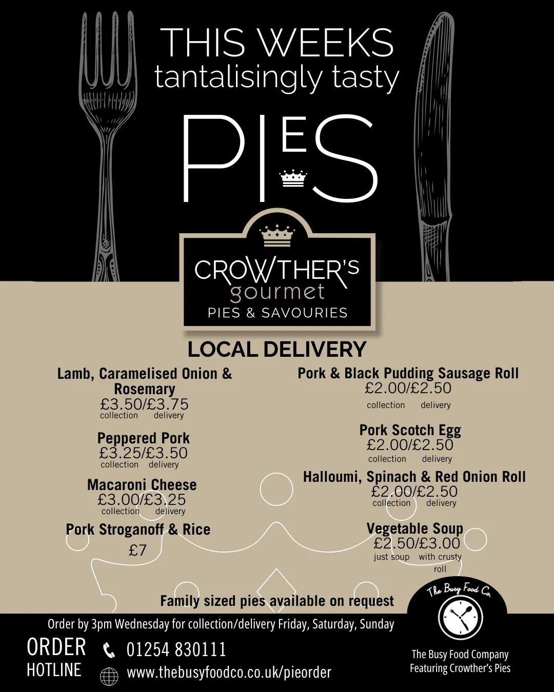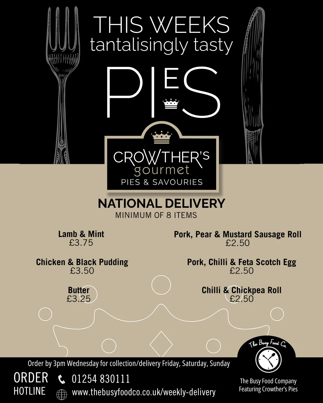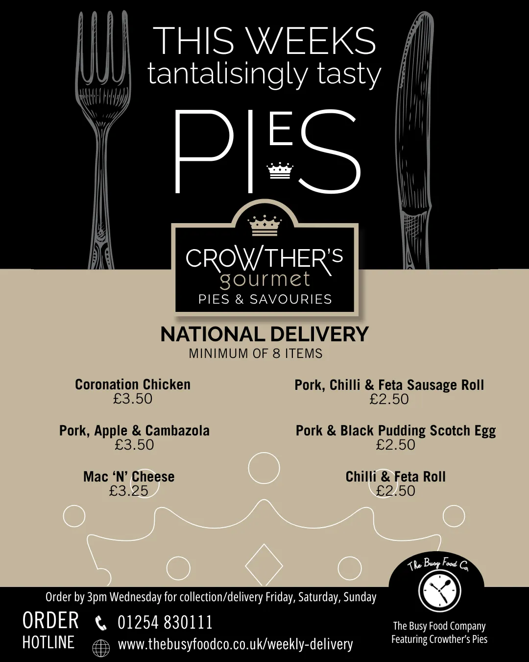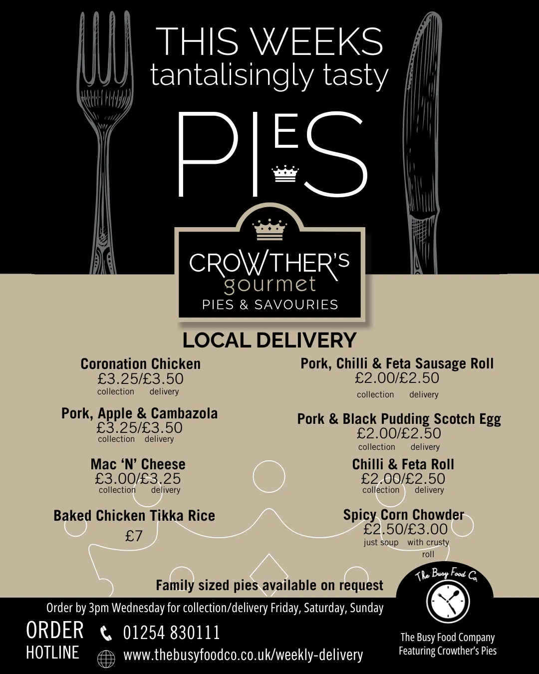 You can now enjoy the same menu our local customers love, delivered by courier the next day. Every pie and savoury is freshly made to order using the same high-quality local ingredients, then packed and sent by next-day courier. It’s the full Crowther’s menu—just delivered to your door. It's a great way to stock up your freezer for the coming weeks or simply something to enjoy that night. Choose your items and we'll take care of the rest. Perfect for busy weeks, gifts, or a treat at home—wherever you are.