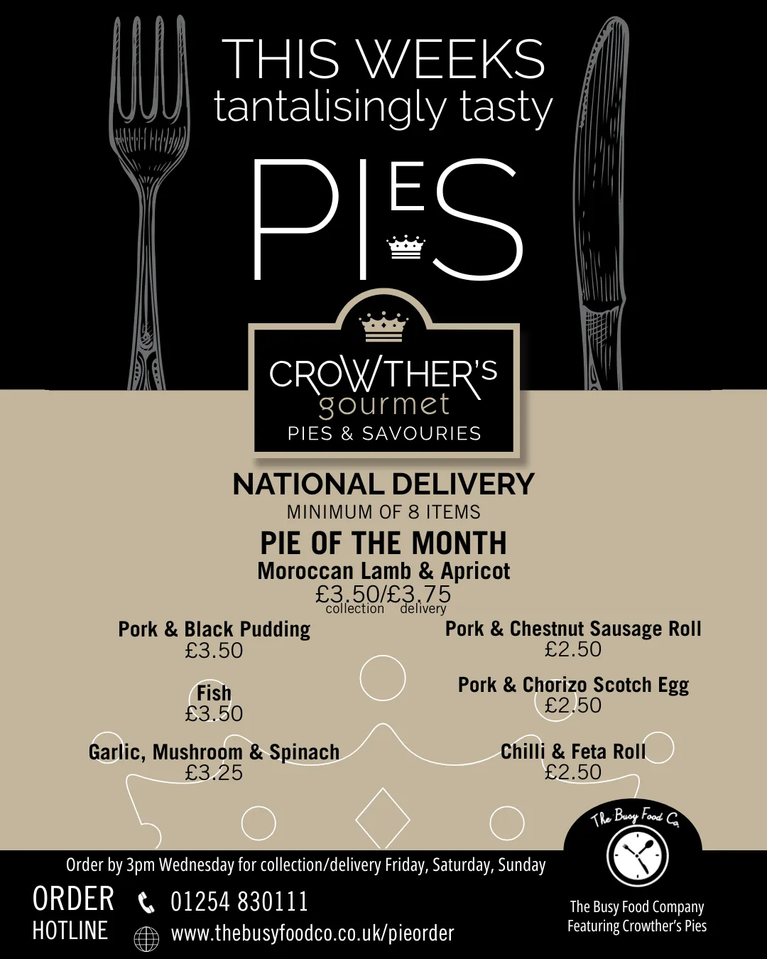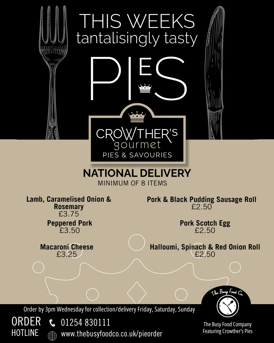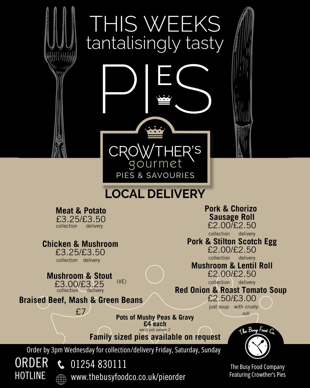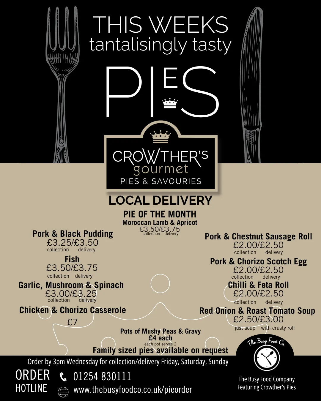 You can now enjoy the same menu our local customers love, delivered by courier the next day. Every pie and savoury is freshly made to order using the same high-quality local ingredients, then packed and sent by next-day courier. It’s the full Crowther’s menu—just delivered to your door. It's a great way to stock up your freezer for the coming weeks or simply something to enjoy that night. Choose your items and we'll take care of the rest. Perfect for busy weeks, gifts, or a treat at home—wherever you are.