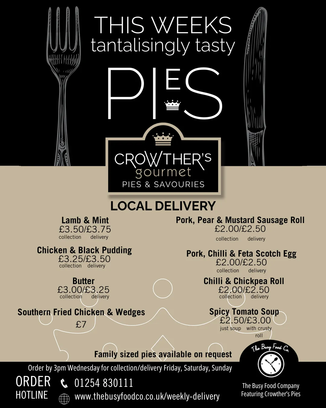 At The Busy Food Company, we know that great food brings people together. That’s why we created Crowther’s Gourmet Pies – a range of handcrafted pies made with high-quality local ingredients and packed with flavour. Whether you need a quick and satisfying meal at home, a crowd-pleasing option for an event, or something special for your customers, our pies are made to impress. From classic steak and ale to creative seasonal specials, each pie is made in our kitchen with care, ensuring a crisp, golden pastry and rich, hearty fillings. Available for home delivery, event catering, and wholesale supply, Crowther’s Gourmet Pies are the perfect choice for anyone who loves proper, handmade food.